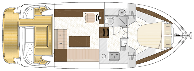 The interior boasts a large island double en-suite cabin forward, rich in natural light and air flow, thanks to twin flush hatches. The saloon and fully-equipped galley provide a generous living space, underpinned by exquisite finishes that include Avonite work surfaces and high-quality cabinetry.