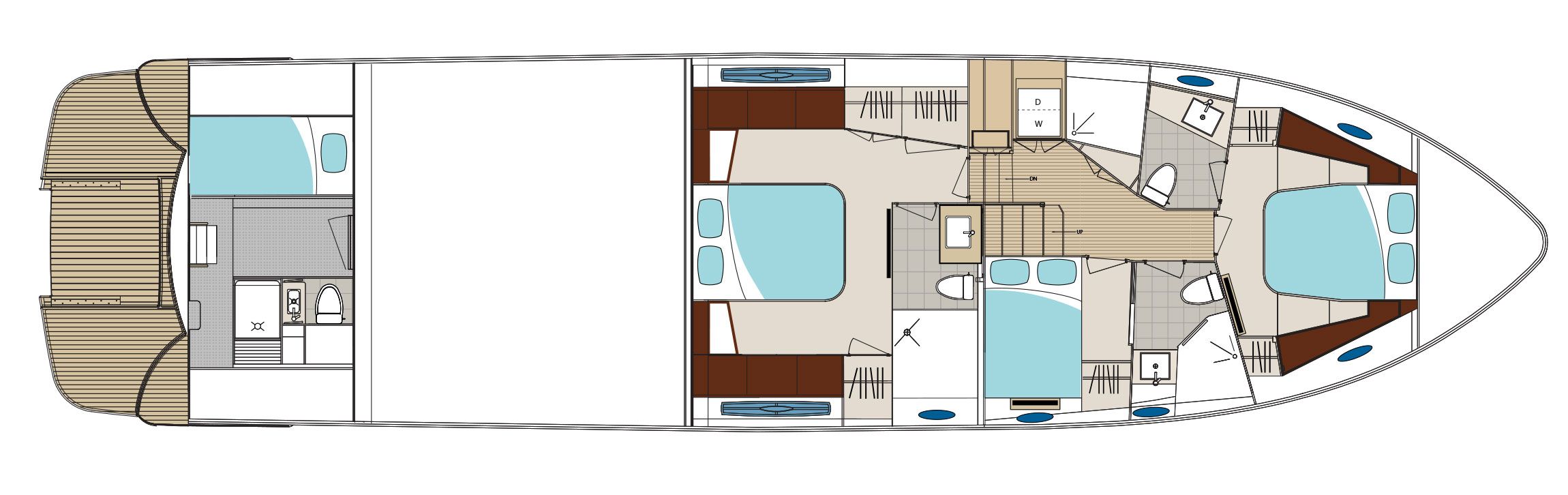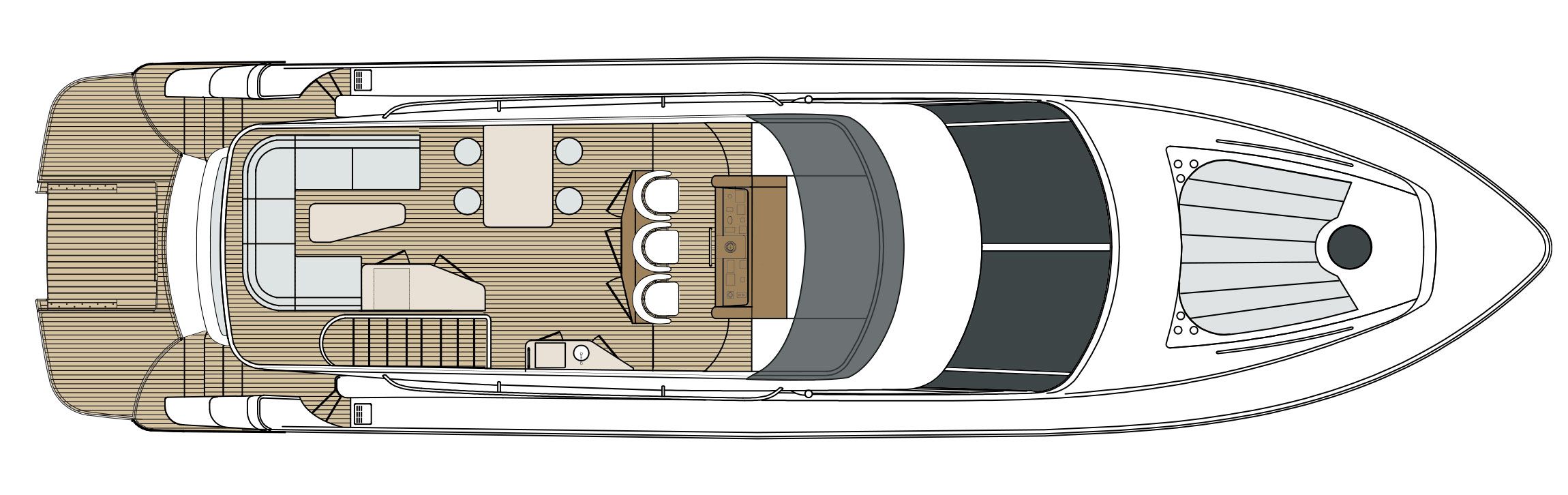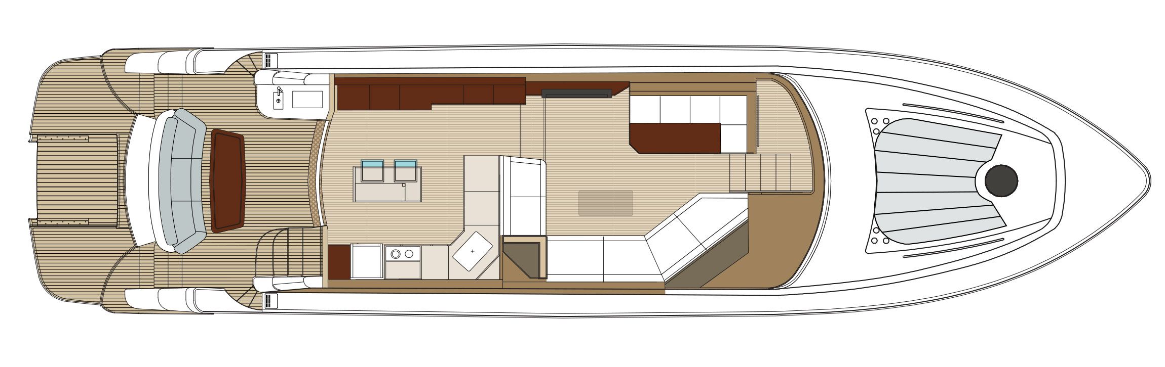 The 650F showcases a revolutionary layout, emphasizing openness, space, and natural light. The aft galley, with its center island, becomes a focal point for social gatherings, seamlessly integrating luxury with functionality. Accompanied by natural walnut woodwork, the interiors exude warmth and sophistication, making every journey memorable.