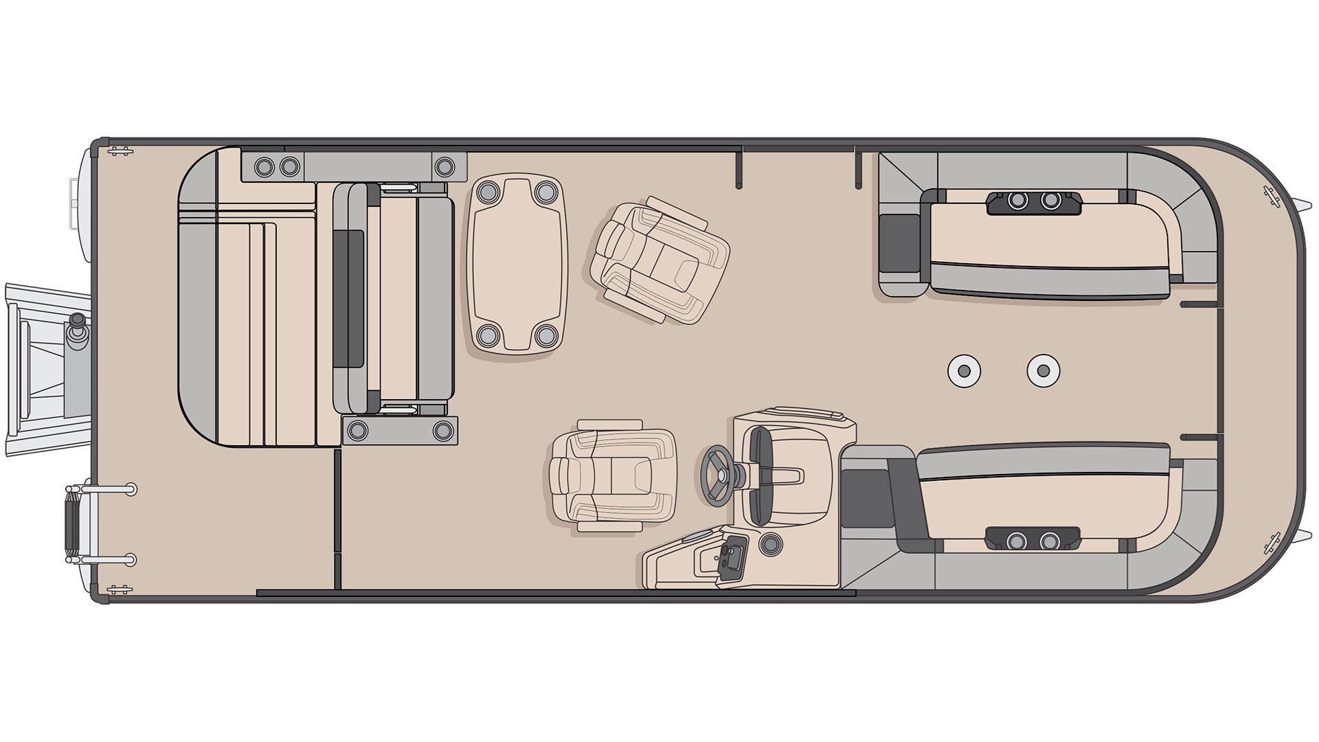 The sleek profile of the Quorum 23 RL, accentuated by slick side panels and black painted aluminum rails, redefines pontoon aesthetics. Its luxurious interior, featuring select dark grey vinyl flooring and plush heavy-weight upholstery, offers an unmatched level of comfort and elegance. With furniture bases and backs made from rotocast, durability meets style in every inch of its spacious layout.