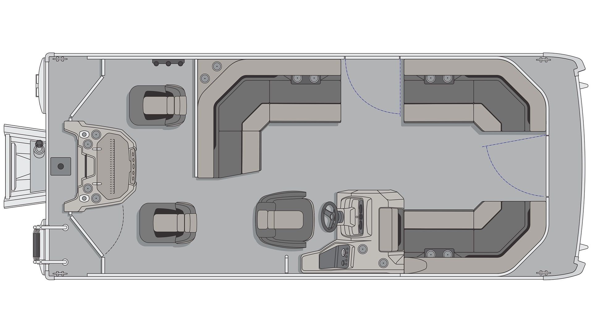 Navigating through this pontoon is seamless thanks to the walk-thru gates at the rear, bow, and port side, all with lift and lock hinges. The 33" built-in aerated stern livewell and meticulously molded casting corners enhance its fishing functionality, making it the perfect escape for casting lines and reeling in the catch of the day.