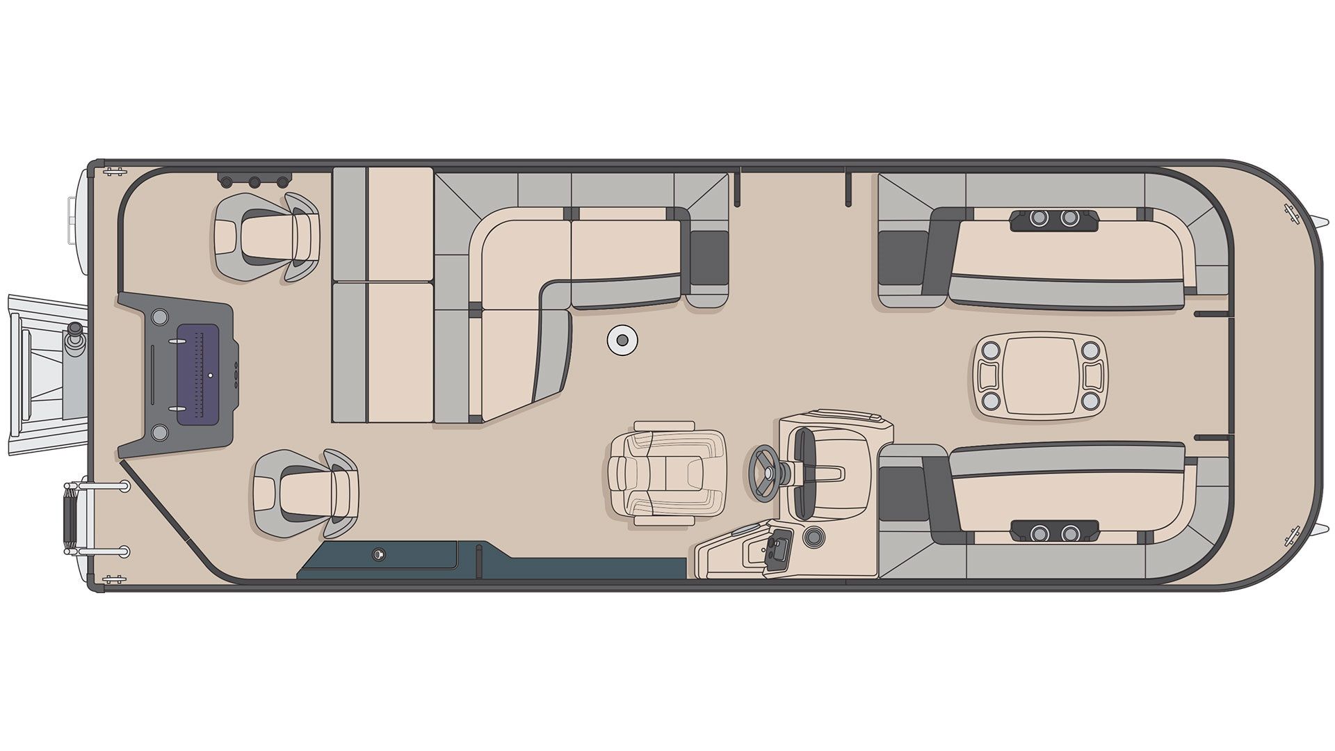 Adorned with slick side panels and black painted aluminum rails, this pontoon showcases an elegance that stands out. A discerning selection of dark grey Teak Supreme Solid Dark vinyl flooring not only adds to its aesthetic appeal but provides lasting durability and ease of maintenance. Walk-thru gates and stainless steel hardware accentuate its design, marrying functionality with form.