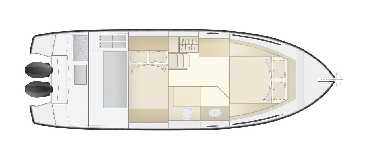 Below deck, accommodations for four along with a bathroom equipped with a shower ensure comfort in your aquatic excursions. Enveloped in abundant natural light, thanks to remarkable glasswork, the below-deck area is a perfect blend of functionality and luxury, promising a 5-star weekend on the waves.