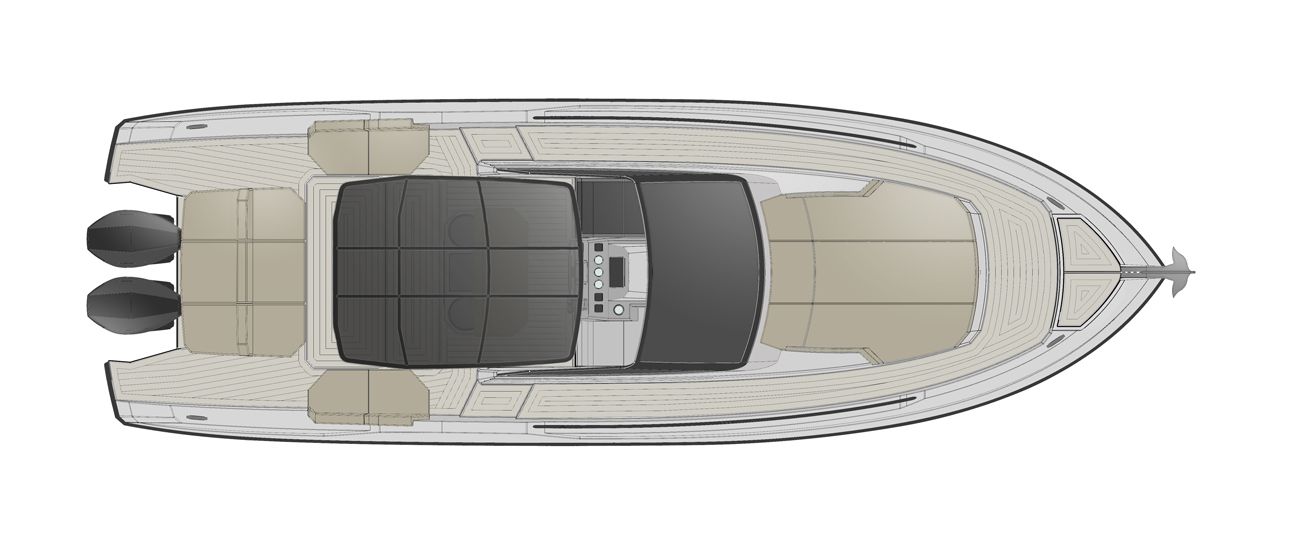 The sophisticated symmetrical lines and bright interiors underscore its innovative design, emphasizing RIO YACHTS' commitment to detail and high-end finishes. On the outside, an expansive cockpit, comfortable sundecks at both the stern and aft, and a sporty T-Top highlight the yacht’s functional elegance, suitable for the refined mariner.