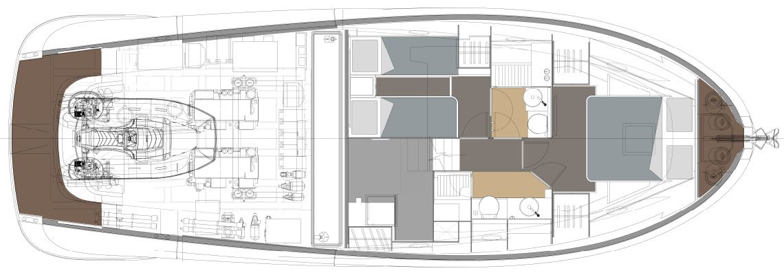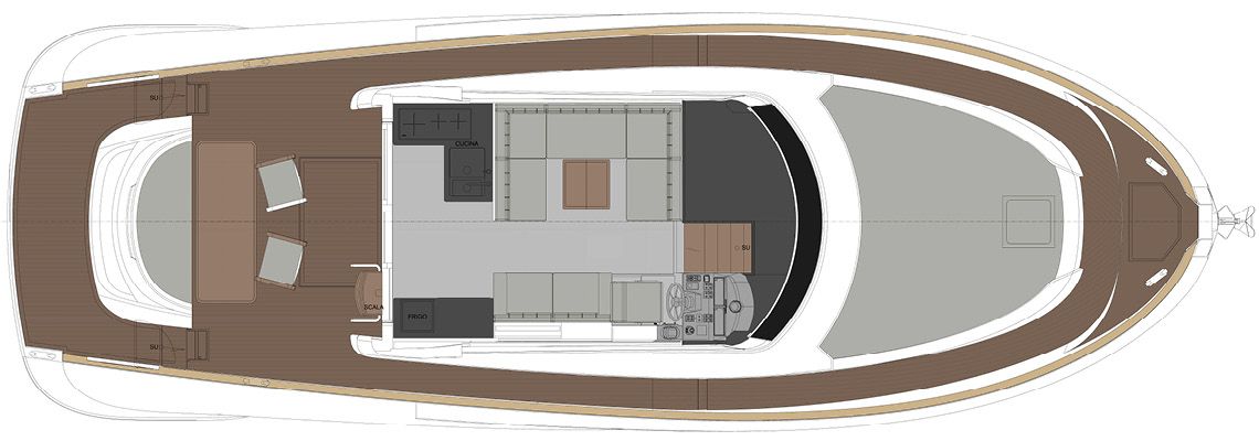 The interior layout, designed with the expert eye of Brunello Acampora / Victory Design alongside Cav. Norberto Ferretti and the Solaris Power Design Team, offers flexible accommodations with options for one or two cabins, and two bathrooms, ideal for up to 12 passengers.